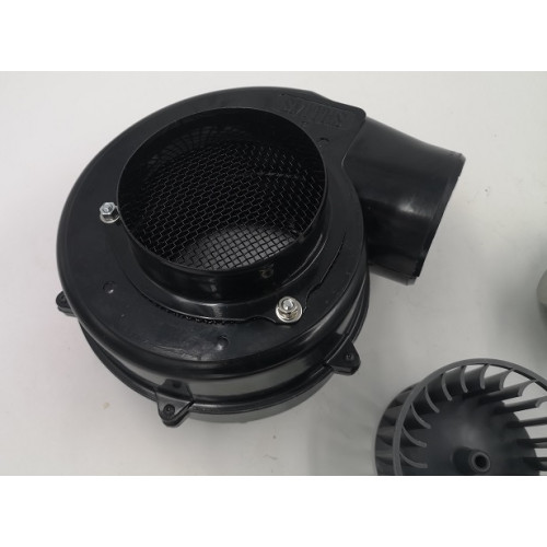 A rebuild kit for the heater blower includes a new case, wire mesh intake, a new electric motor and fan.